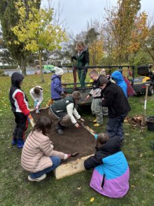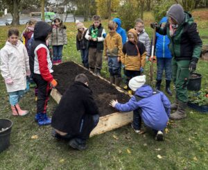 Auf dem Schulgelände unserer Grundschule wurde am 28. Oktober trotz regnerischen und stürmischen Wetters ein neues Kräuterbeet gebaut. Gemeinsam mit dem Zimmerer Hans Klippert und der Gärtnerin Sabine Kaufmann aus dem Schloss Hirschgarten in Nassenerfurth arbeiteten die Schülerinnen und Schüler der dritten Klasse tatkräftig an diesem Projekt mit. Ausgestattet mit Gummistiefeln, Regenhosen und Gartenhandschuhen konnten alle mit anpacken.