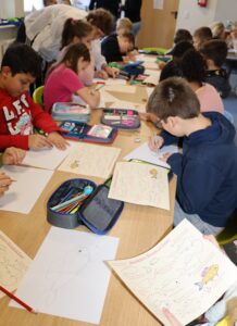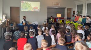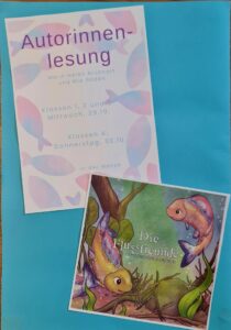Am 29. und 30. Oktober fand in unserer Grundschule eine Autorinnenlesung für alle Kinder statt. Die Autorin Marit-Helen Brunnert und Illustratorin Mia Baden lasen aus ihrem Buch „Die Flussfreunde – ein unvergessliches Abenteuer “. Dafür verwandelte sich unsere Mensa für zwei Tage in ein Vorlesezimmer mit Lesesessel. Die Lesung fand in Zusammenarbeit mit der Oberen Naturschutzbehörde des Regierungspräsidiums Kassel und der Bauverwaltung der Stadt Borken im Projekt „Renaturierung der Schwalm“ statt. Zweck der Lesung war es, den Kindern einen altersgerechten, erzählerischen Zugang zum komplexen Ökosystem Fluss zu ermöglichen. In den eigens für die jeweilige Altersgruppe konzipierten Lesungen nahmen die Autorinnen die Kinder mit in die Welt eines Flusses mit seinen Bewohnern und Gegebenheiten. Sie erfuhren durch die Protagonisten, drei junge Äschen, welche Funktionen die einzelnen Bewohner im Ökosystem Fluss haben und welche Auswirkungen Flussbegradigung und Flussrenaturierung auf die Lebensbedingungen im und am Wasser haben. Bereits seit den Sommerferien wurden die Kinder im Sach-, Deutsch- und Kunstunterricht intensiv auf das Thema vorbereitet. Sie malten Bilder, erstellten Steckbriefe von Tieren des Flusses und bemalten Holzfische. Die Rohlinge für diese Fische wurden großzügigerweise von der Firma Wohrathaler Holzbau GmbH gespendet. Weiterhin fand ein Ausflug ins Wassererlebnishaus Fuldatal statt. Im Anschluss an die Lesungen zeigten die Autorinnen den Kindern, wie ein solches Buch entsteht: Wie die Fische Timmi, Lou und Robin als Idee und dann als Skizzen Gestalt angenommen haben und wie Text und Bild später zusammengefügt wurden. Schließlich konnten sich die Grundschulkinder selbst als Künstlerinnen und Künstler ausprobieren und die „Flussfreunde“ nach Anleitung selbst zeichnen oder farblich gestalten. Als Andenken erhielt jedes Kind ein eigenes Buch.