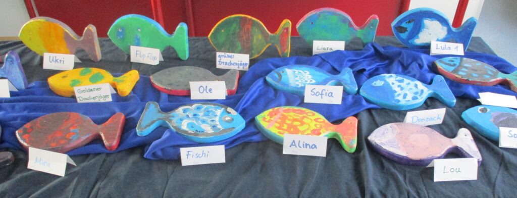 Unsere Mensa hat sich am 23. Januar in einen Ausstellungsort verwandelt, an dem alle Schülerinnen und Schüler individuell gestaltete Holzfische präsentierten. Die Rohlinge dafür waren freundlicherweise von der Firma Wohrathaler Holzbau GmbH gespendet worden. Entstanden sind die Kunstwerke im Rahmen eines Unterrichtsprojektes zur Renaturierung der Schwalm. Jedes Kind hatte einen hölzernen Fisch nach eigenen Vorstellungen gestaltet. Die entstandenen Werke spiegeln nicht nur verschiedene heimische Fischarten, sondern auch persönliche Gedanken, Gefühle und Wünsche im Hinblick auf eine gesunde, artenreiche Schwalm wider. Nach wetterfester Lackierung durch unseren Schulhausverwalter Herrn Simanowitsch sollen die Fische für alle sichtbar an einer Wand des Schulgebäudes dauerhaft ausgestellt werden.